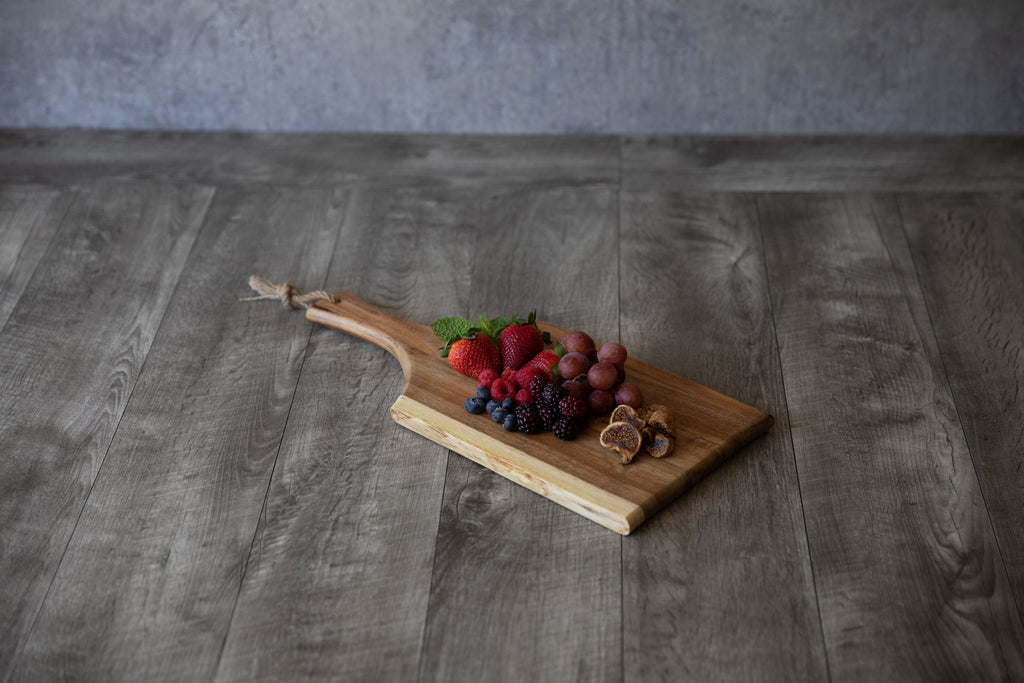 The centerpiece of every dinner party or wine & cheese tasting, the Artisan 18" Acacia Serving Plank can be used as a cheese board, a bread board, or for cutting vegetables. With a live edge on the side of the board and rustic rope on the end of the handle, this cutting board looks equally lovely on the table or hanging in your kitchen.