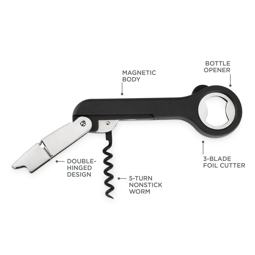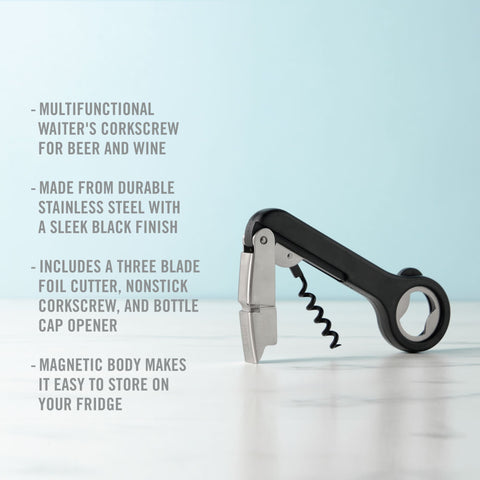 While compact, this corkscrew offers much more than meets the eye. The double-hinged design and non-stick worm make opening any wine bottle easy. This gadget works overtime as a bottle opener and a foil cutter.