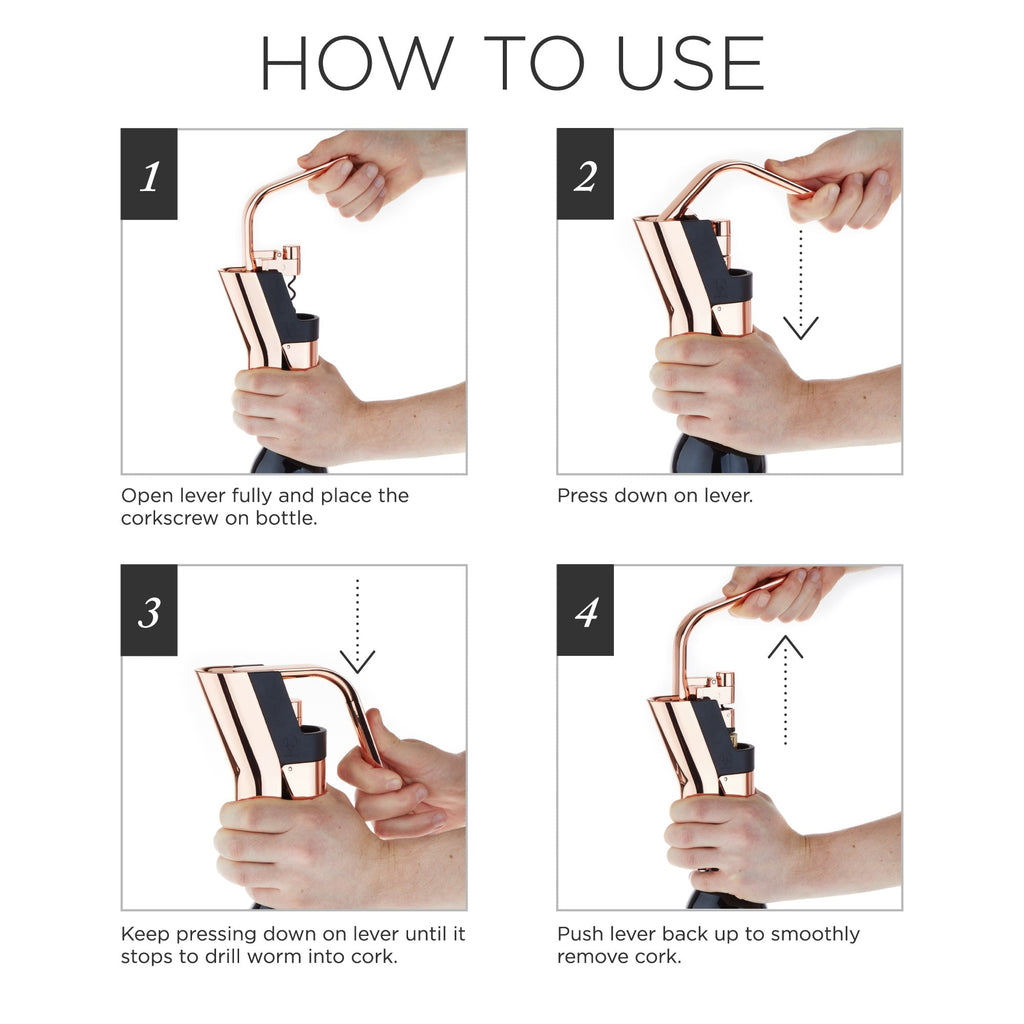 Leaving a lasting impression, this state-of-the-art lever corkscrew marries function and aesthetic for the ultimate home-bar accessory. Uncork bottles with one smooth motion; one pump of the handle and you're ready to pour.